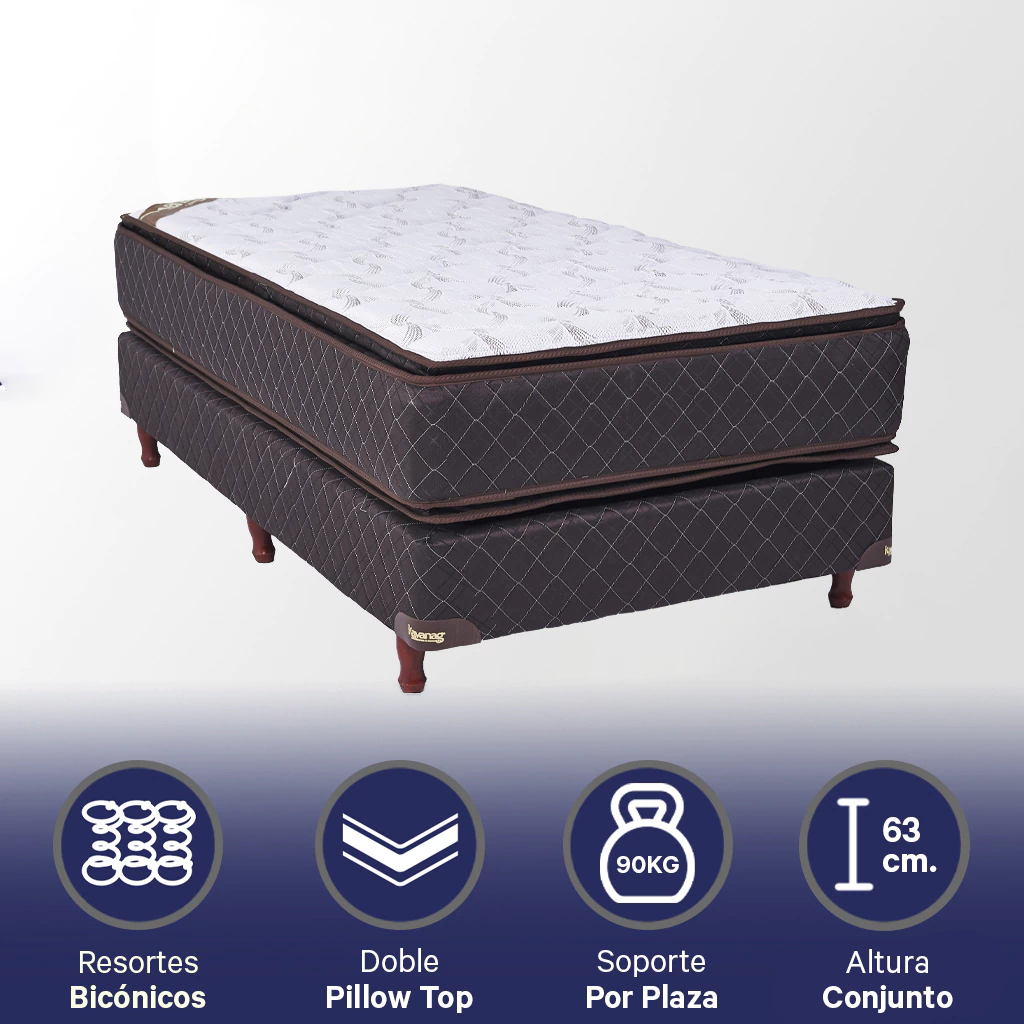 Colchón con estructura de Resortes Bicónicos entrelazados linealmente, doble marco perimetral de acero templado y estabilizadores laterales. Tapizado en tela de jackard totalmente matelasseado, espectacular altura de 31 cm gracias a su doble pillow top que te ofrece el mismo confort en ambas caras del colchón, por lo que puedes rotarlo y darle vuelta, alargando aún más su gran durabilidad. El conjunto se acompaña de un elegante sommier revestido en tela jackard marrón y superficie antidelizante para que el colchón no se corra, y patas de madera torneada.