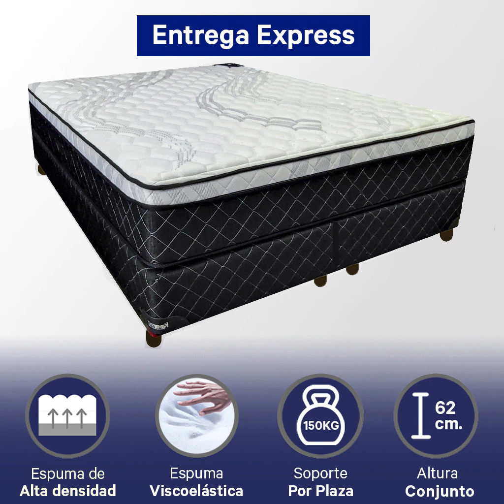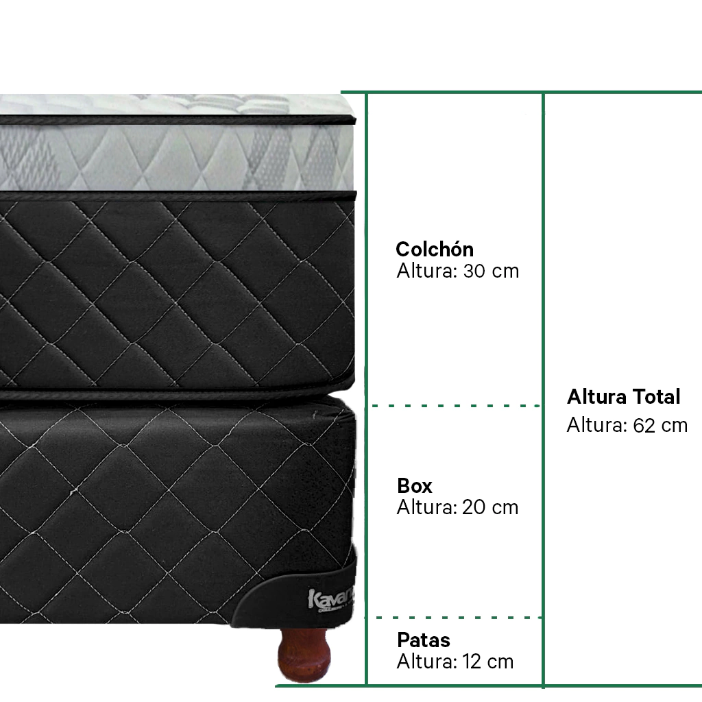 Este colchón esta diseñado para soportar hasta 150 Kg por plaza y tecnologìa Just-Twist para que solo lo rotes de cabecera a pies, para mayor practicidad. El conjunto se acompaña de un elegante sommier revestido en tela jackard negra y superficie antidelizante para que el colchón no se corra, y patas de madera torneada. Altura Total del Conjunto: 62 cm